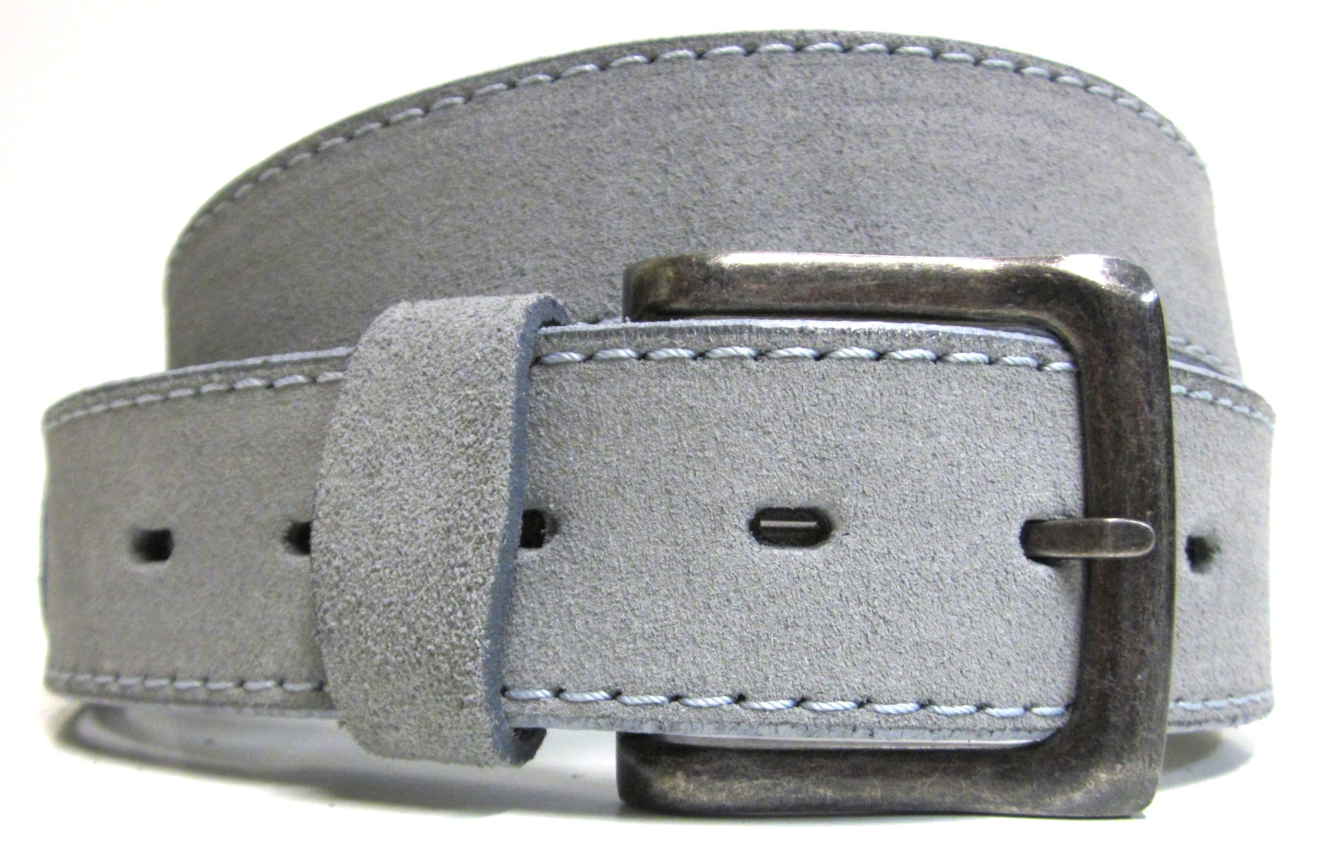 - pánske opasky zo šedej brúsenej hovädzej kože so zinkovou prackou a koženým pútkom